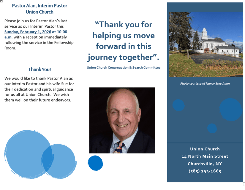 Several churches have joined together to provide food for families who need a little extra help in the Churchville/Riga area. Despite this combined effort, the food shelves at Union Church are always in need of replenishment. Donations of canned and non-perishable food items are always appreciated. If you are interested in donating, please call 585-293-1665 to make arrangements.